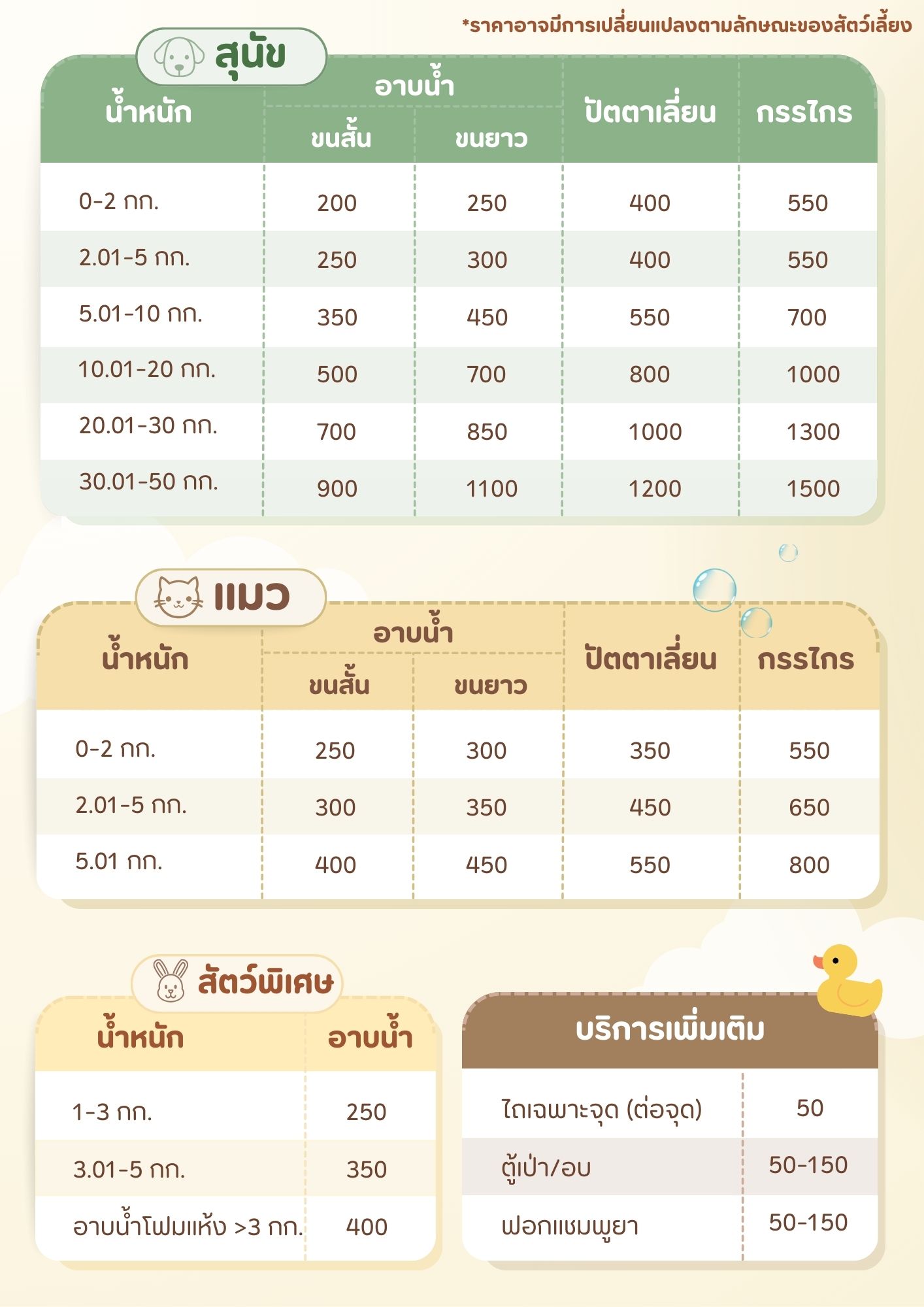 *หมายเหตุ: รายละเอียดค่าบริการอาจเปลี่ยนแปลงไปตามลักษณะของสัตว์เลี้ยง